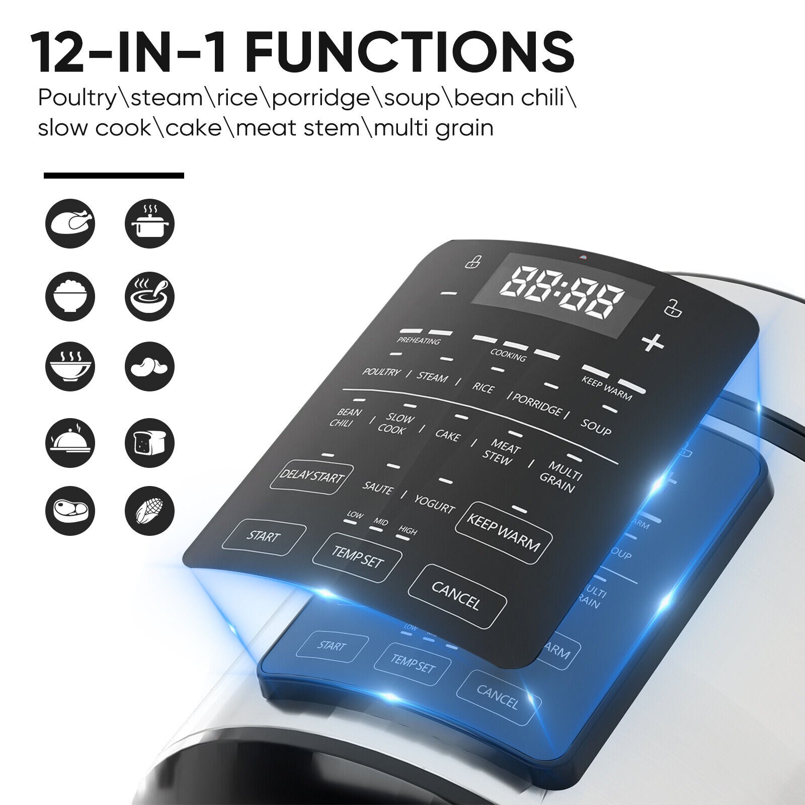 All-in-One Kitchen Companion: Transform your cooking with the 6 Qt 12-in-1 Pressure Cooker, a multi-cooker that replaces 9 appliances in one. Whether you're pressure cooking hearty stews, slow-cooking tender meats, or baking a fluffy cake, this device simplifies meal prep with 12 versatile cooking functions.
