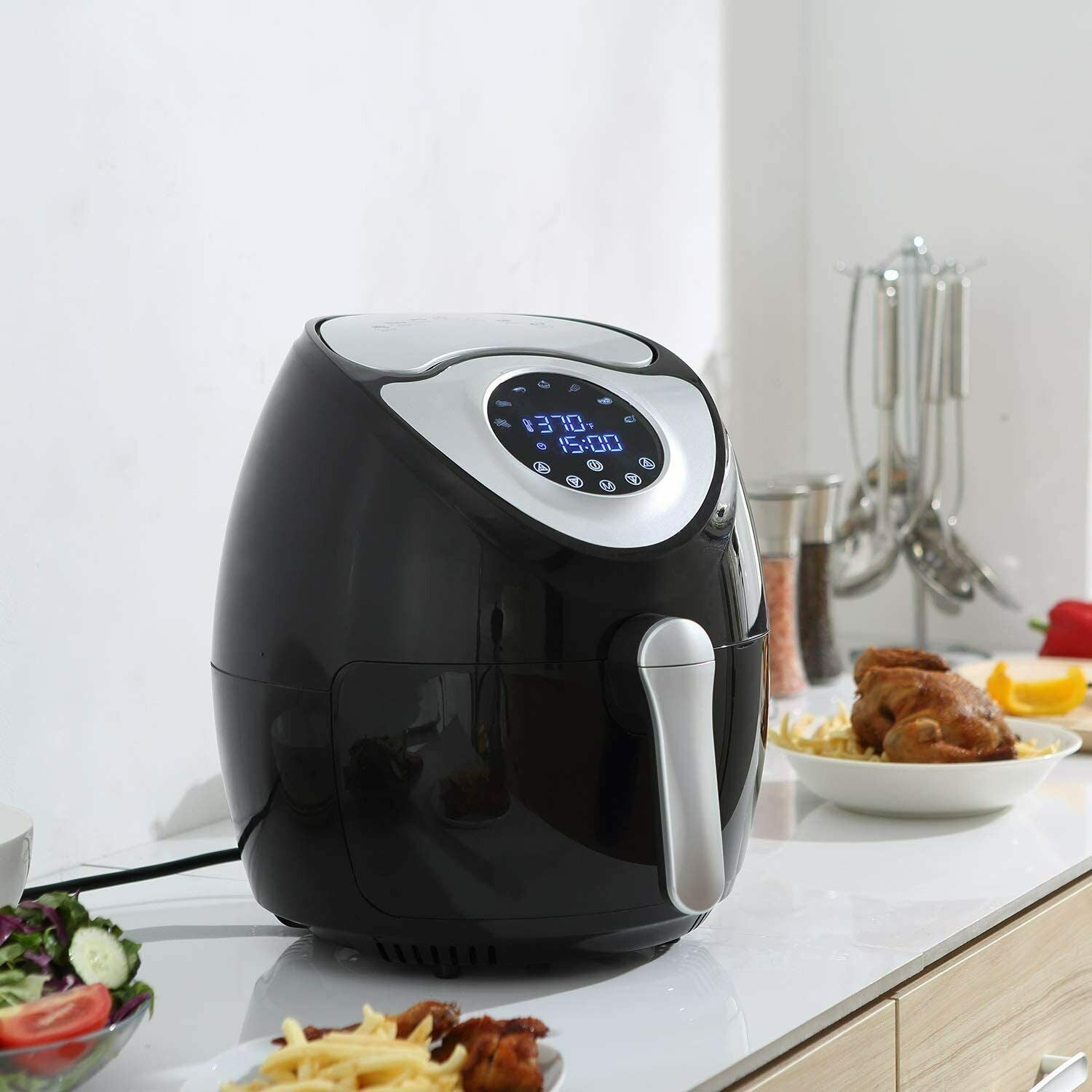 LCD Panel for 7 Cooking Presets: The LCD screen allows you to control your air fryer by a single touch. Pick between its 7 cooking presets and select the right function between rotisserie, dehydrator, bbq grill or fries. It comes with a recipe book for all new air fryers cooks who may need some meal ideas.