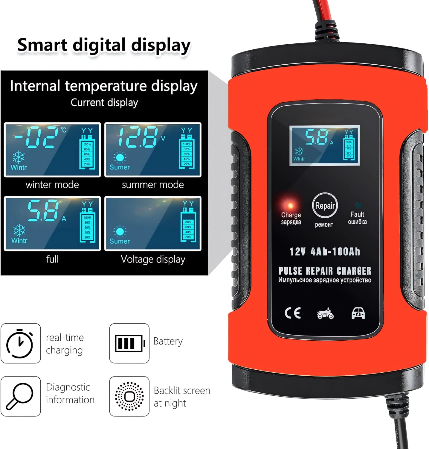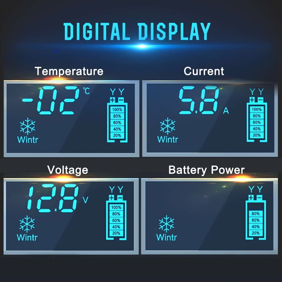Intelligent LCD Display: The Car Battery Charger's LCD screen automatically detects environmental conditions and battery status, displaying vital information such as voltage, current, temperature, and season modes, providing an informative charging experience.