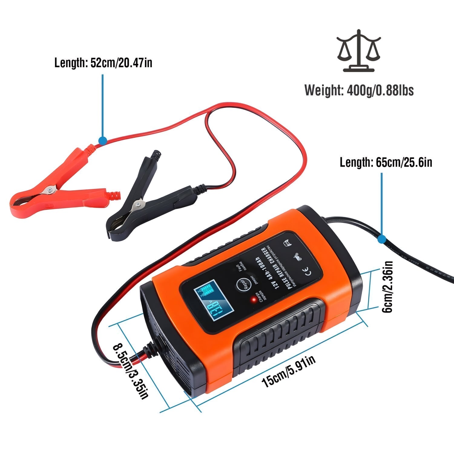 Versatile Compatibility: Designed to accommodate a wide range of 12V lead-acid batteries with capacities ranging from 4Ah to 100Ah. Our Portable Car Battery Charger supports various types, including AGM, GEL, flooded (Wet), calcium, deep cycle, and VRLA maintenance-free lead acid batteries, making it suitable for cars, motorcycles, lawnmowers, boats, RVs, SUVs, ATVs, and more.