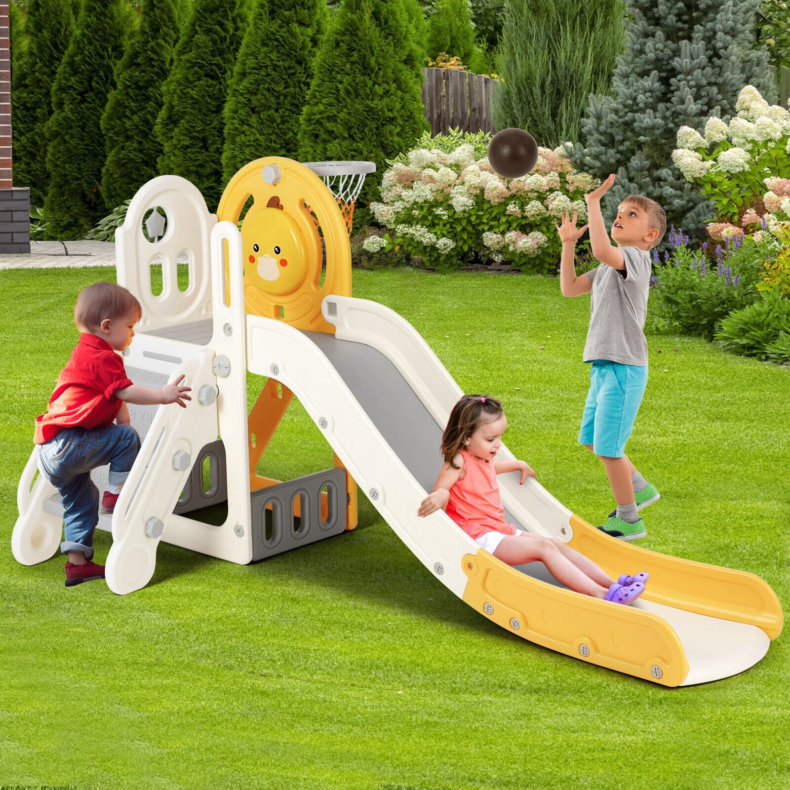 Crafted from safe, eco-friendly HDPE material. Our High-quality Kids Slide is not just a slide, it's a pathway to cherished memories. Picture their gleeful smiles as they conquer the gentle slope, practice their basketball skills, and explore the cute duck-themed design. It's more than a playset. It's a journey of growth, laughter, and precious moments. Make your child's childhood unforgettable with this heartfelt gift.