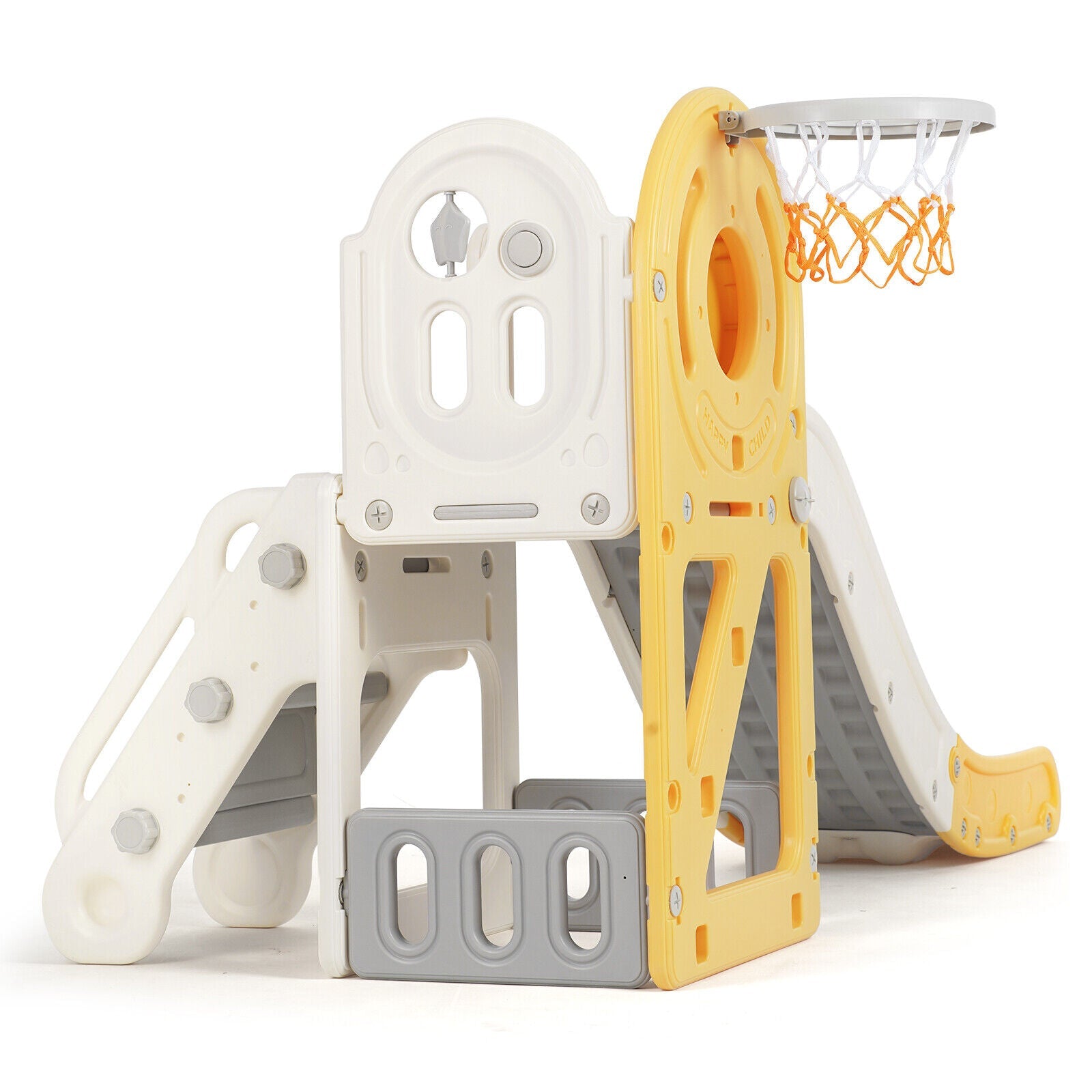 Multifunctional Playset: Experience the joy of 5 activities in one with our Slide For Toddlers, including a smooth, extra-long slide, a basketball hoop for skill development, ample storage space, and a non-slip enclosed ladder, enhancing hand-eye coordination and agility.