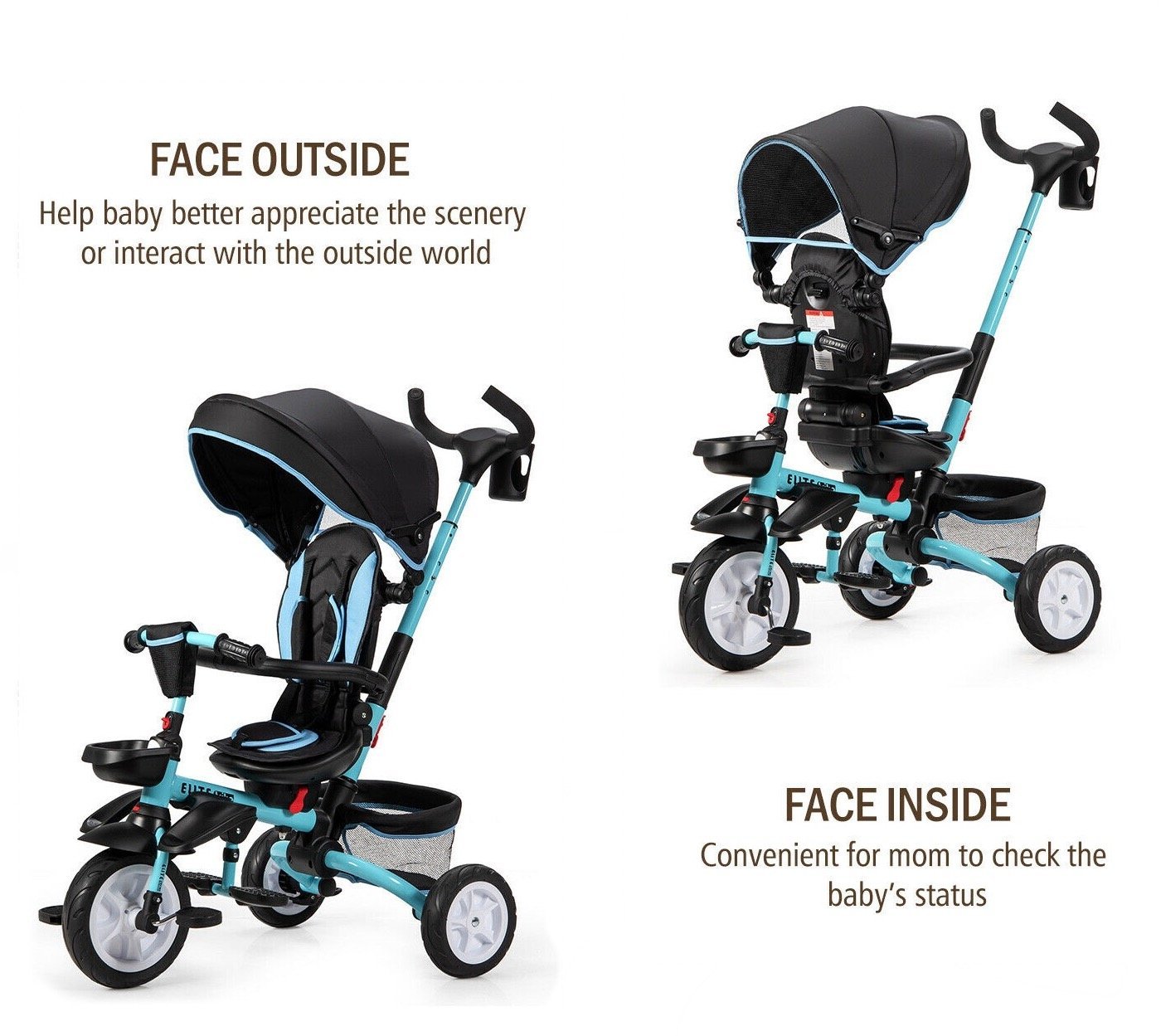 CONVENIENT ROTATABLE SEAT: With the steering tricycle you can switch between a face-to-face design, when you want to monitor your baby closely and maintain an interaction while strolling in the park, or you can rotate the seat for 180 degrees and allow your child to explore the outdoors!