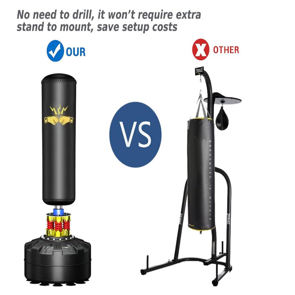 Premium Construction: Designed with multi-layer construction, including a stainless steel tube stand, eco-friendly fabric buffer, high-density EPE foam, and covered with 2mm Premium PU Leather, our boxing bag withstands long-term use, resisting tears and ensuring fast rebound.