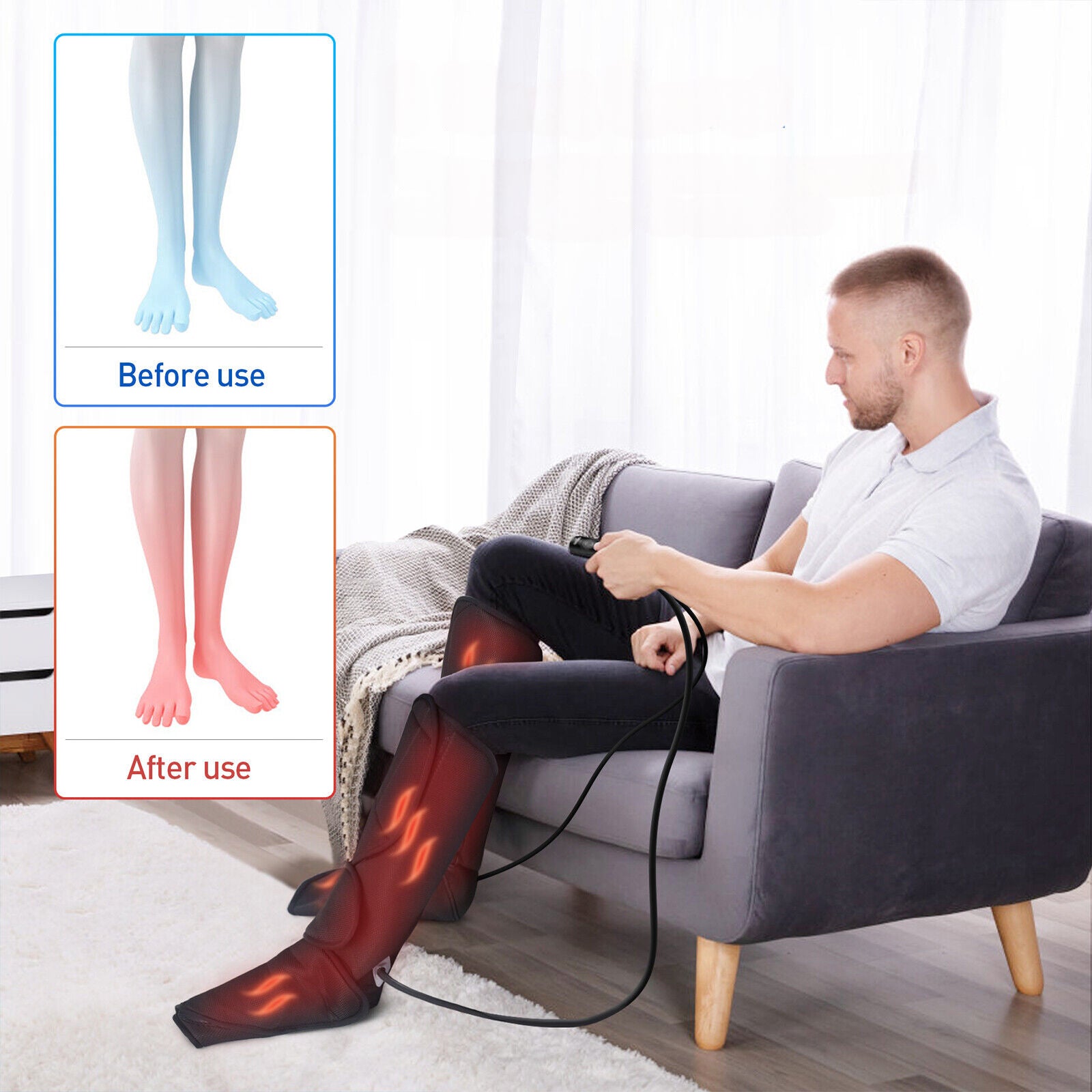 Adjustable Wraps: Our Foot and calf Massager's Velcro design ensures a secure and comfortable fit for all users. Easily adjust the wraps for the perfect fit, making it hassle-free to enjoy a customized and relaxing experience.