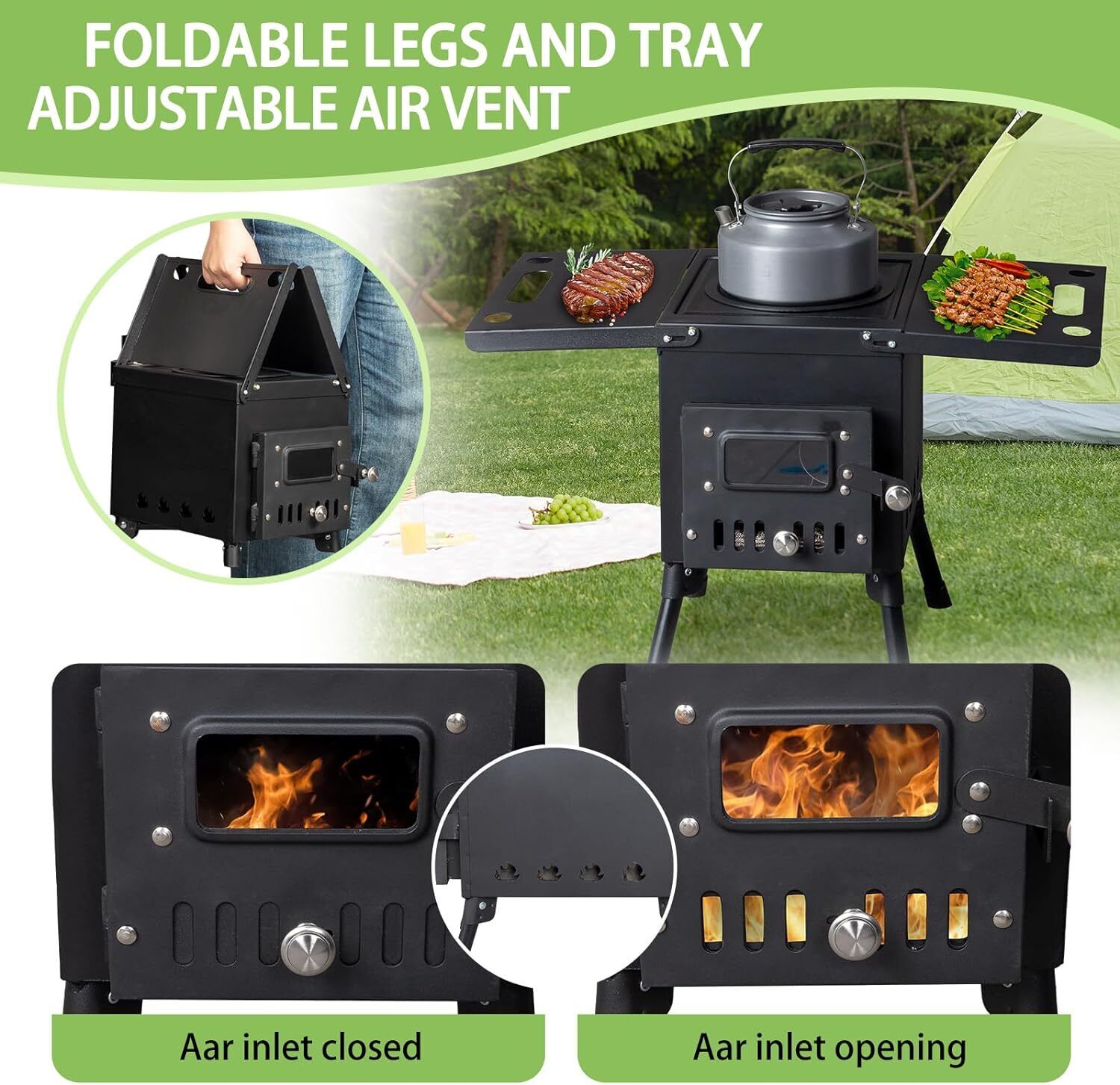 Outdoor Portable Wood Burning Stove Adjustable Air Vent with Pipes for Vented Tent Cooking
