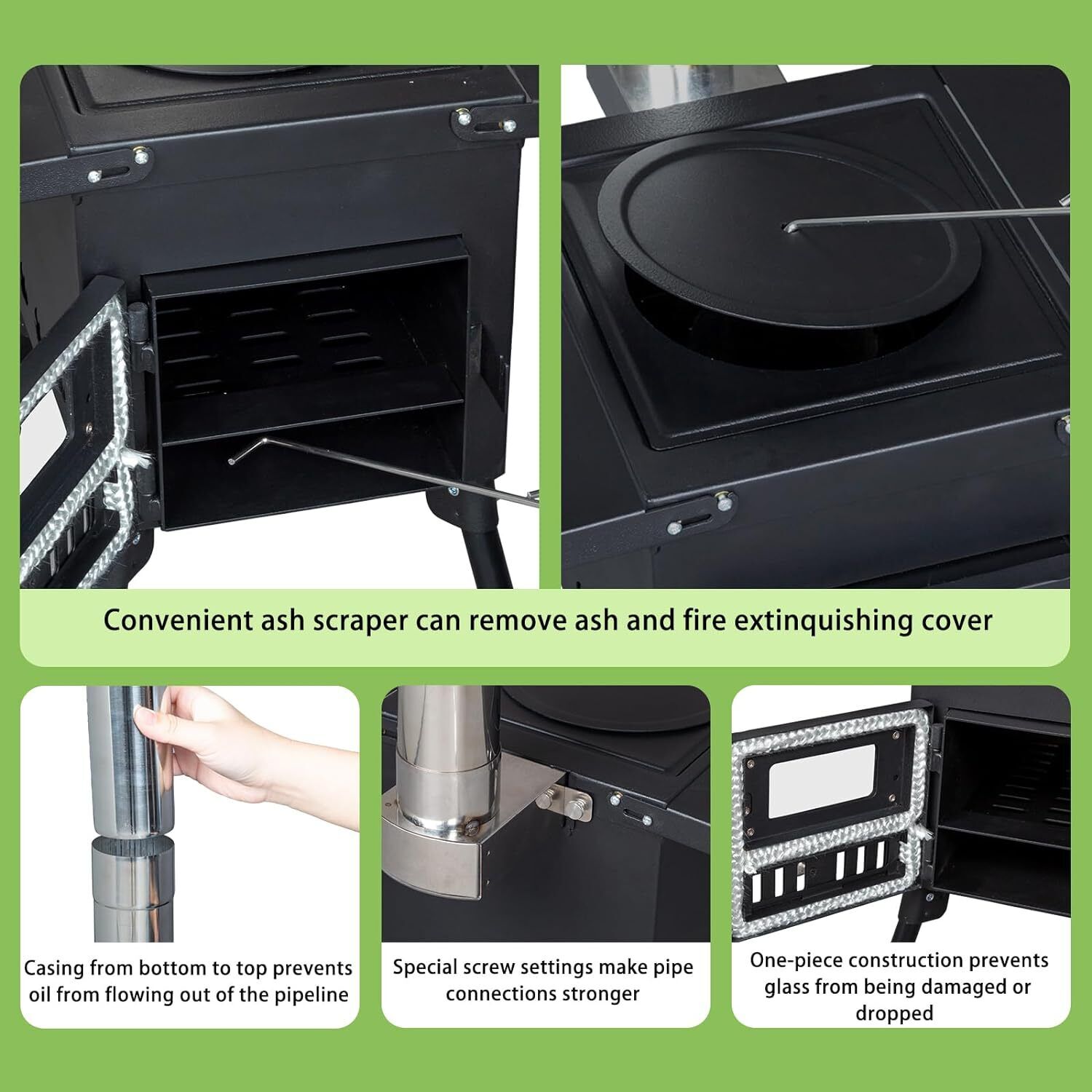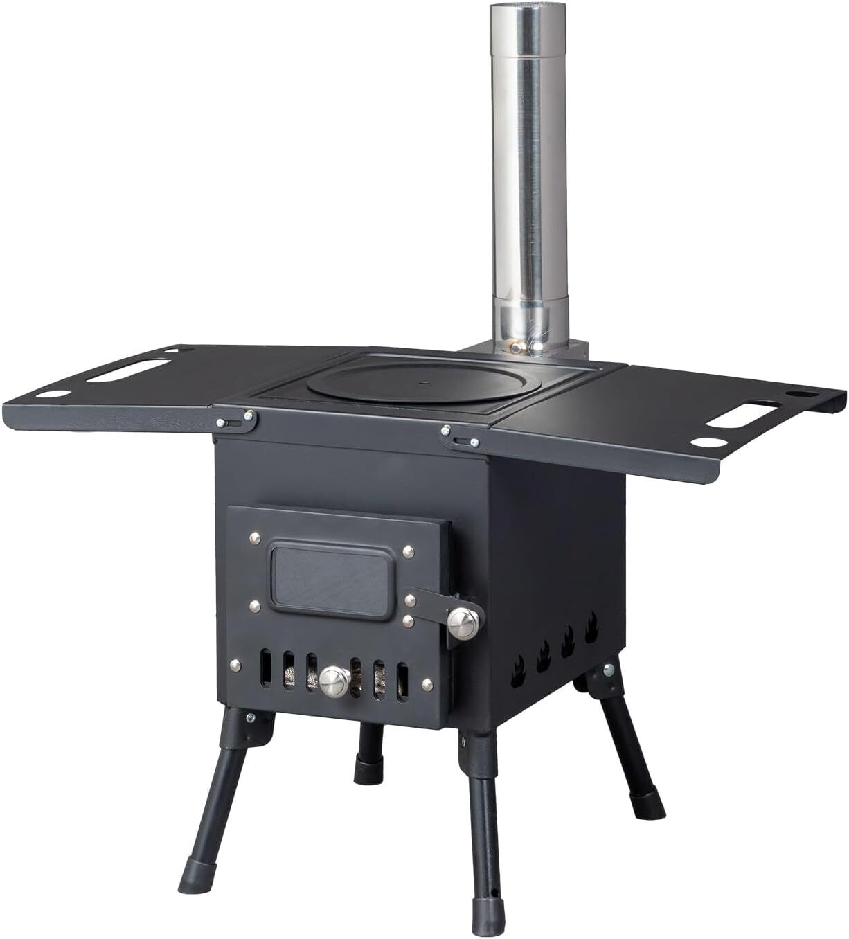 Enhanced Features: With side shelves for holding cups or food during cooking, and a front hinged door for easy access and ventilation control, this stove is both user-friendly and efficient. The package includes 3 pipes, a chimney horizontal intubation, detachable legs, a firewood hook, and a pair of gloves, ensuring you have everything you need for a comfortable outdoor experience.