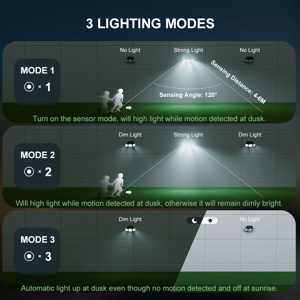 Three different light modes: You can easily choose a mode that fits your needs perfectly! There are two options with sensor mode - one where the lights will be completely off when there is no motion and the second one will have the lights dimmed with no motion. Next to that you have a mode that will keep the lights always on.