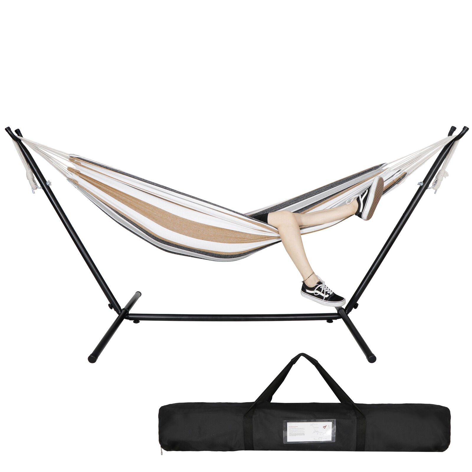 All-Weather Stand: These portable hammock stands are constructed with resilient and weather-resistant resin steel. The stand provides unwavering stability and reliable support, ensuring a safe and secure lounging experience.