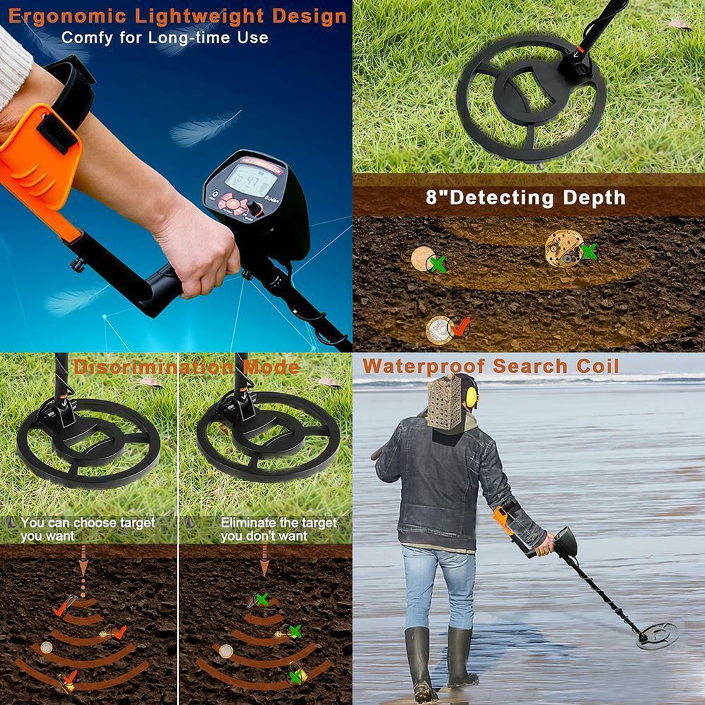 High quality equipment: Our gold metal detector contains a pair of headphones as well as the 3 tone audio sensor that will recognize different types of metal. High tech LCD display will always precisely show the sense level, battery life, target, target depth, and metal type.