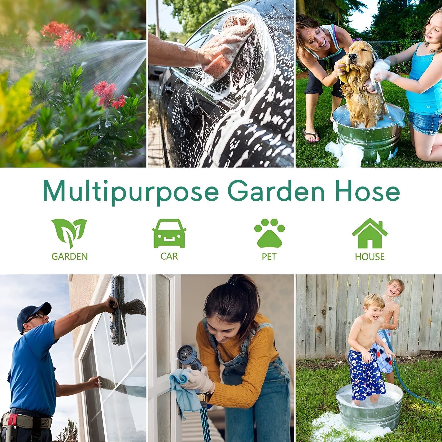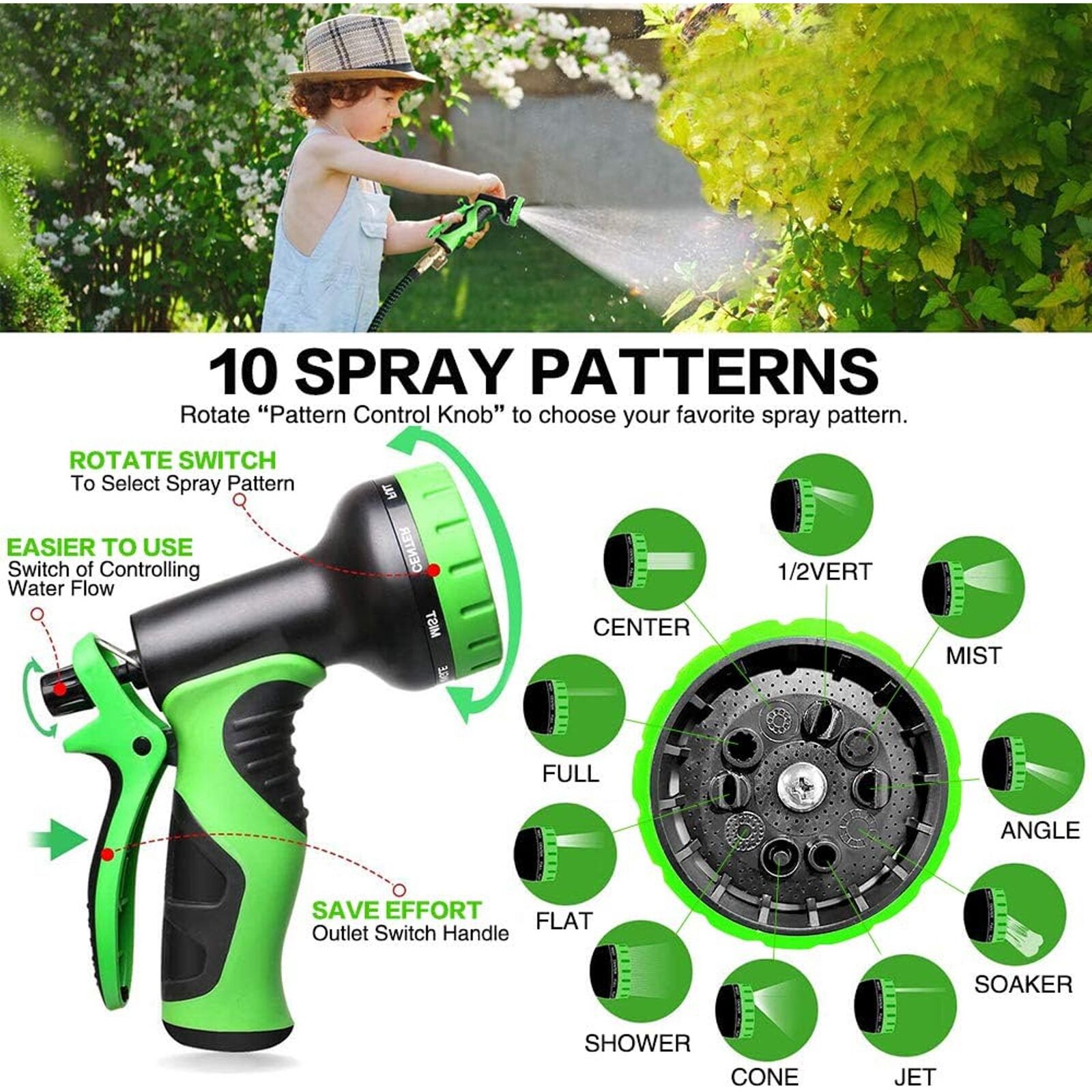 10 Pattern Spray Nozzle: Equipped with a 10-pattern hose nozzle, this garden hose offers more functionality than typical 8-pattern nozzles. From misting delicate flowers to power washing your driveway, your car, or even your backyard, the versatile nozzle settings meet all your watering and cleaning needs. The ergonomic design ensures comfort during extended use, making it ideal for a variety of outdoor tasks.