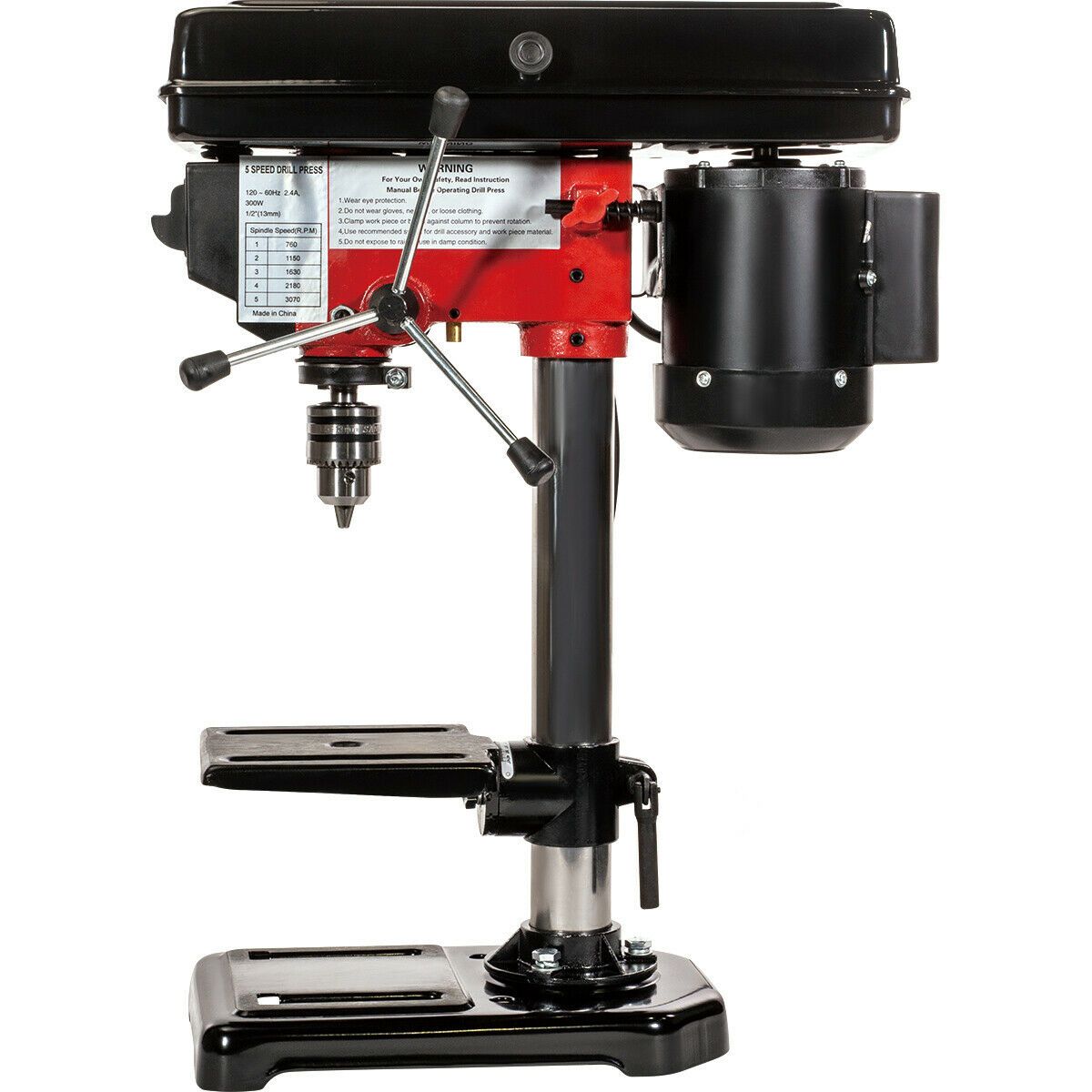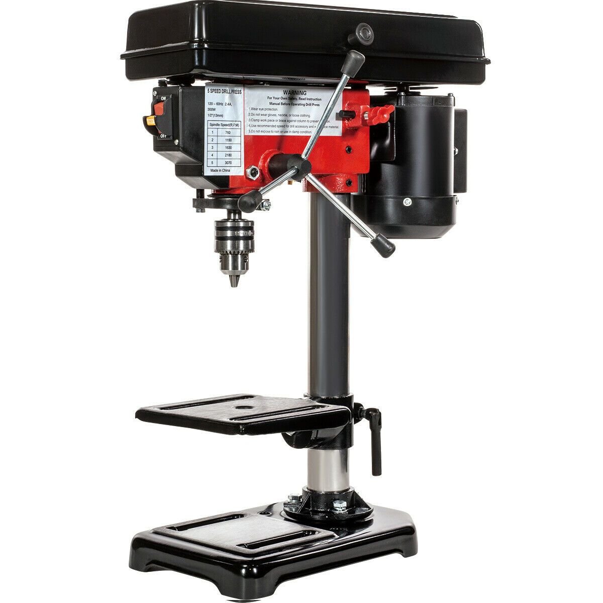 Powerful Motor with 5 Speed Orientation: If you talk about efficiency, durability, and longevity, this drill press has it all. It comes with a 1/3 hp motor with ball bearings that builds enough torque to cut smoothly through the toughest of materials. You can even adjust the speed of the motor at 5 different rates: 760, 1150, 1630, 2180, or 3070 rpm. This feature offers a more customized experience for the operator.